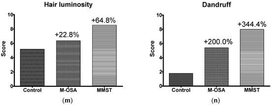 Comparison of means of self-efficacy questionnaire variables as a function of group at the end of the study (T5). (a) skin general appearance; (b) skin hydration; (c) homogeneity of skin color; (d) darkened areas—intensity; (e) darkened areas—quantity; (f) skin imperfections; (g) skin luminosity; (h) hair hydration; (i) hair nutrition; (j) hair softness; (k) hair vitality; (l) hair aging signals.; (m) hair luminosity; (n) dandruff. All parameters listed showed significance differences between both treatments and the control.