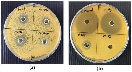 (a) Antimicrobial susceptibility of shampoos containing the fermented product of O. sanctum. Shampoo containing the fermented product of O. sanctum. Top left: shampoo containing 2% (w/w) of the fermented product of O. sanctum (FO2); top right: shampoo containing 5% (w/w) of the fermented product of O. sanctum (FO5); bottom left: shampoo containing 10% (w/w) of the fermented product of O. sanctum (FO10); bottom right: shampoo base (Base). (b) Antimicrobial susceptibility of commercial shampoos; top left: C1; top right: C2; bottom left: formulation C; bottom right: DI water.