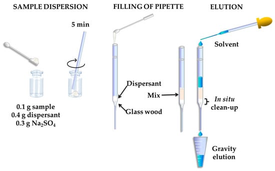 Recently, Guerra et al. have been working on improving the simultaneous analysis of a great number of chemically different dyes in a broad range of cosmetics, including rinse-off and leave-on products [24,26,29]. In 2015 [29], they introduced the matrix solid-phase dispersion (MSPD) for the first time in the analysis of dyes in cosmetics. MSPD is a valuable approach for solid and semisolid samples for its simplicity and the possibility of performing a clean-up step simultaneously. In this case, miniaturization of the conventional procedure employing a Pasteur pipette as device in order to pack the sample dispersed (see Figure 3), allowed extracting quantitatively nine dyes in many cosmetics including lipstick, nail polish or toothpaste. More recently, they published a new method [26] based on miniaturized MSPD with significant improvements in relation to the previous one. In this work, 19 permitted and banned dyes were analysed, 10 more than in the former, in a broader range of matrices, which involved a re-optimization of the sample preparation procedure using experimental designs. The Pasteur pipette was replaced by a 2 mL syringe to enable an adequate solvent elution employing the dispersant chosen as the optimum, C18. The most recent multi-dye method was also reported by Guerra et al. [24]. Single-step vortex extraction and simultaneous clean-up was applied to the analysis of dyes as well as preservatives in different cosmetics, many of whom have not been analysed yet. In comparison with other approaches based on simple solvent extraction assisted by ultrasounds or centrifugation, this method offers advantages in terms of simplicity, rapidity and minimal consumption of solvents. In addition, it may be considered more environmentally friendly since it avoids the use of solvents such as dichloromethane or chloroform.