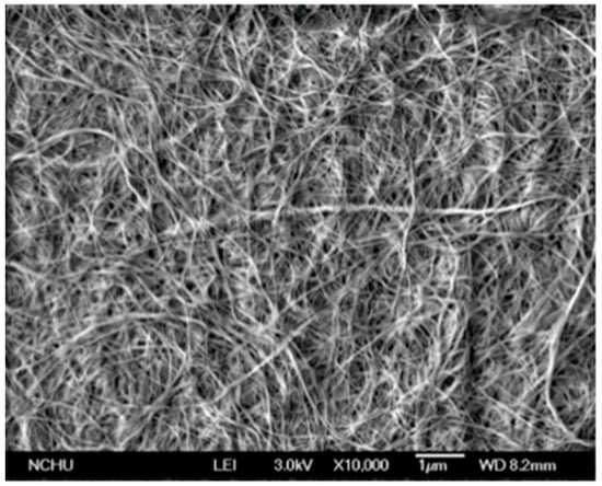 Fiber structure of bacterial cellulose (BC) observed using scanning electron microscopy at 10,000× magnification.