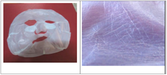 A patented BC facial mask was fabricated with holes for the eyes, mouth, and nose. The author claimed that such a mask may be suitable for repeated or prolonged use for skin beautifying purposes, skin nutrition, and moisturizing and cosmetic effects [11]. An American study describes a method for manufacturing masks from bacterial biocellulose by directly adding extracts of ginseng (known for its antioxidant and anti-inflammatory properties) to the culture broth; results show overall user satisfaction in terms of moist feel and skin elasticity in women aged 30+ years [11].