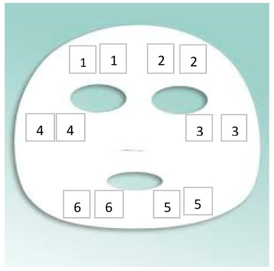 Both sheets and masks to be analyzed were extracted from the sachet and completely unfolded, stretched, and laid on the work surface, looking for visible stains or folds. Then, three specific areas to be scanned were selected (the same for all performed analyses) with reference to actual face areas: upper section (corresponding to forehead), median section (cheek), and lower section (chin). For each area, the points analyzed are split between the right and the left, as shown in the Figure 3. The right/left name is referred to the viewer’s point of view, with the sample lying on the work surface.