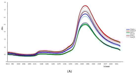 The maximum wavelength of all recorded spectra values was 1453.2 cm–1, for placebo masks manufactured with BC Sheets (from Supplier 2), as shown in Figure 7A,B. This wavelength has eventually been used to check the quality and homogeneity of samples. A correlation coefficient (95%) between each spectrum was taken as a threshold for the acceptance of batches, as suggested by the European Medicines Evaluation Agency (EMEA) notes of guidance for NIR applications in industrial processes [24]. Samples were considered to conform if they had a maximum absorption within the range mean ±95%. All samples tested showed acceptable values, according to this principle.