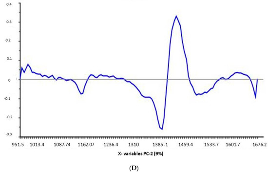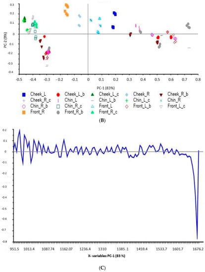 The results show very clearly that the first one sheet from the top (1604_1) is different from the others (Figure 6A). The loading plot (Figure 6B) indicates that the same peaks, at around 1676 cm−1 and 1450 cm−1, are responsible for this difference. This is probably due to a non-homogeneous distribution of the aqueous solution used for soaking BC sheets, also provoking a different stretching of the cellulose molecule OH, responsible for the hydrogen bond with water. This finding reveals that a suitable storage protocol must be applied by manufacturers, before releasing every batch product, to allow a thorough soaking process.