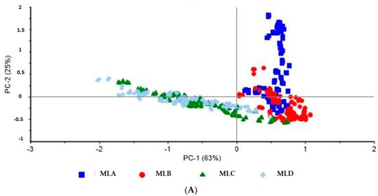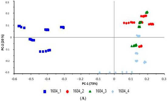 Data obtained from NIR analysis were pretreated and then evaluated using principal component analysis (PCA). Figure 4 shows the results obtained on BCS coming from Supplier 1.