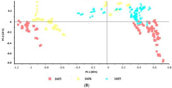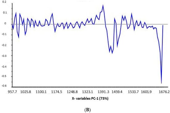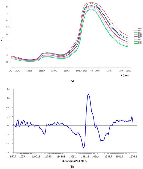 Mathematical elaboration of NIR spectra: (A) PCA plot and (B) loadings plot for PC1 for BCS coming from Supplier 2.