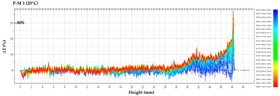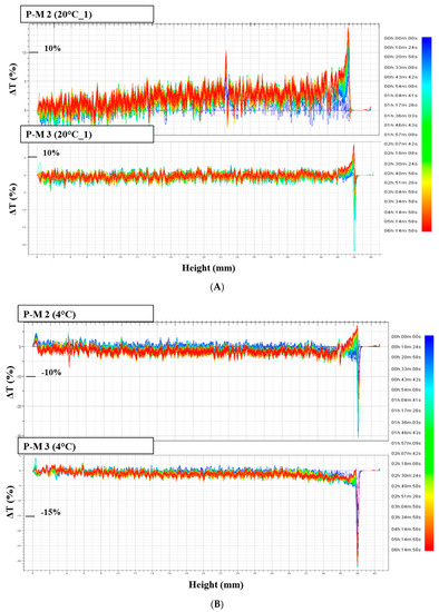 In Figure 9 transmission profiles (ΔT) of batches P-M 2 and P-M 3 are reported, and measurements were made at different temperatures (20 °C, then 4 °C and, finally, 20 °C again).