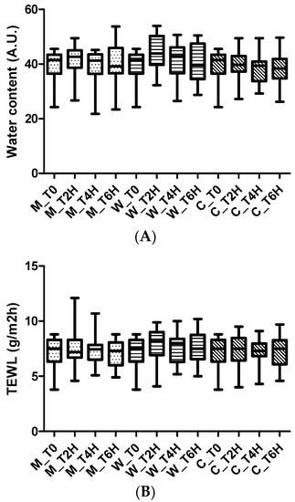 Results obtained from this work highlighted that a noticeable hydration effect is attributable to placebo masks (M). Upon a single application, hydration becomes statistically significant after two hours (p = 0.0292*). Control area C (not treated) and W area (treated with water) were used for comparison.
