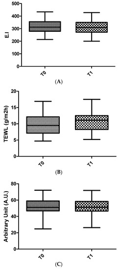The assessment of skin barrier integrity, and the possible occlusive effect caused by the use of the product object of this study, have been performed by a Tewameter TM 300 (Cutometer MPA580, Courage & Khazaka, Cologne, Germany) [22,23]. Transepidermal water loss (TEWL) is assessed in terms of g/m2h by a skin evaporimeter made of a small cylindrical open chamber (1 cm in diameter, 2 cm in height) with a couple of hygrometric sensors connected to a microprocessor plugged into a computer workstation. The device allows recording of TEWL values (ranging from 0 to 90 g/m2h), as well as the relative humidity (ranging from 0 to 100%) and the probe temperature.