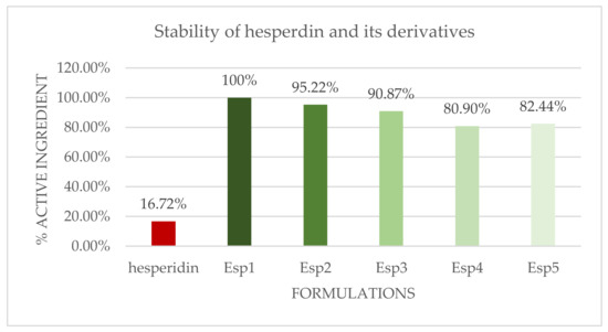 In the present study, hesperidin and its five synthetic derivatives were formulated using the same base formulation (at a concentration of 0.3%) and subjected to accelerated aging in an oven at 40 °C for 120 days. At each time point, the concentration of the active ingredient was monitored by HPLC analysis.