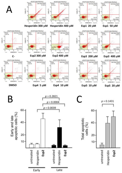 Since anti-proliferative effects might be associated with the activation of apoptotic pathways, apoptosis was analyzed on the K562 cell line after treatment with hesperidin and its analogues for three days. Two different concentrations were used close to the relative IC50 values. All these concentrations were selected starting from the anti-proliferative effects shown in Table 5, except for Esp1 and Eps3, which were added at concentrations never exceeding the maximum concentrations used for these hesperidin analogues in the cell proliferation assays reported in Table 5. This was conducted in consideration of their already discussed precipitation effects in the aqueous medium, requiring the use of concentration values lower than their solubility limit. Table 6 shows the obtained results on the pro-apoptotic effects of these compounds, using the assay system, which enables the identification of early and late apoptosis stage, after comparison to untreated control cells (C-). The data shown in Table 6 originated from the analysis of the corresponding Muse Analyzer plots, after 72 h of treatment (representative results shown in Figure 2).