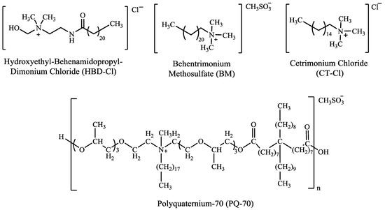 Hydroxyethyl-behenamidopropyl-dimonium chloride (HBD-C1) and behentrimonium-methosulfate were provided by CRODA (Snaith, United Kingdom), whereas cetrimonium chloride was supplied by BASF (Ludwigshafen, Germany). The remaining raw materials were provided by the cosmetic company Belleza Express S.A. (Cali, Colombia) and used as received. Water Type II (ultra-pure water) was obtained from a purification system called Millipore Elix Essential (Merck KGaA, Darmstadt, Germany).