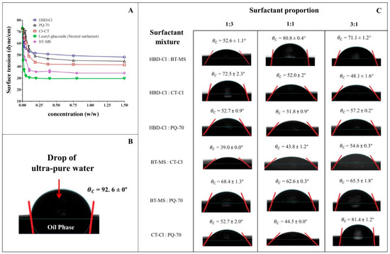 In contrast, Figure 2B indicates that the boundary generated between the water and the oil phase has a hydrophobic interface of θc = 92.6°, [20,21,23], which decreases when the surfactants were incorporated into the aqueous phase (Figure 2C). Such a marked decrease was more evident in the mixtures that contained the CT-Cl surfactant, as opposed to the mixtures containing the HBD-Cl or PQ-70 surfactants. These results prove very interesting, considering that the largest proportion of the oil phase is made up of cetearyl alcohol and coconut caprylate, which are fatty compounds with alkyl chains composed of 14–16 carbon atoms. It seems the cetrimonium chloride (CT-Cl) surfactant, which has an alkyl chain length of 14 carbon atoms, is the emulsifier with a higher affinity to the oil phase.