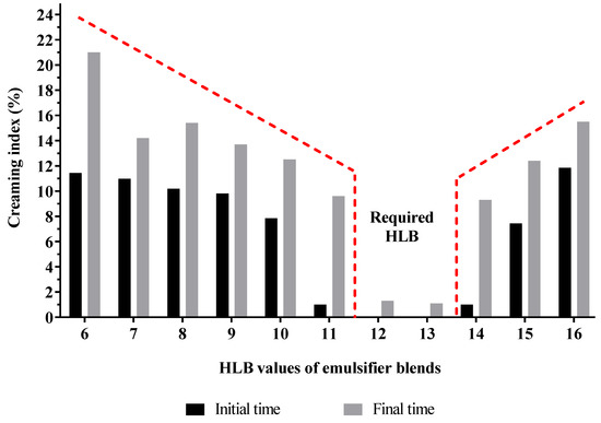 According to the thermal stress study conducted, it was found that the lowest creaming index values were obtained when the system presented a surfactant HLB value between 12 and 13 (Figure 3).