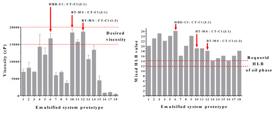 The results of the viscosity and mixed emulsifier HLB used in the hair conditioner prototypes are shown in Figure 4. Also, the calculations used to determine the HLB values for the emulsified prototypes are detailed in the supplementary material. In regard to the pH of the emulsified systems, these were adjusted between 4.0 and 4.5. This is due to the required pH values of these types of products [30].
