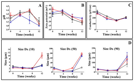 Results of (A) pH, (B) electrical conductivity, (C) zeta potential, and (D) particle size distribution for the selected prototypes as a function of time. ○ HBD-Cl + CT-Cl (3:1), □ BT-MS + CT-Cl (1:3), Δ BT-MS + CT-Cl (3:1).