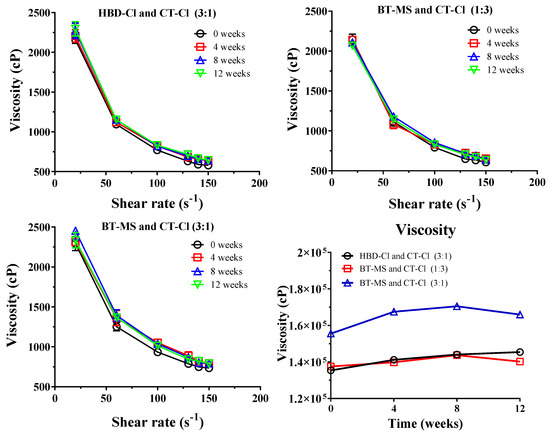 Here, three prototypes were observed to behave in a pseudo-plastic way [6] since the viscosity of the system decreased with an increase in shear rate. Such rheological behavior, which was required for these types of products was due to the dosage and application form [14] that remained during the 12 week evaluation process. It is very important that this rheological behavior remained in time, because this ensures that the product (hair conditioner) can be used by consumers correctly [30,37]. In contrast, an increase in viscosity was obtained up until the 8th week, which saw to the viscosity stabilize then decrease at the 12th week. This phenomenon may be attributed to how the emulsions were manufactured; where high shear forces are typically applied, which tends to incorporate air into the system, affecting the cohesiveness of the phases. Over time, however, the systems began to recover their internal configuration [38] and this stability could also be attributed to the Hydroxy-ethyl-cellulose polymer used as the viscosity agent [39]. Nevertheless, the two systems that contain the BT-MS surfactant do start to decrease at week 12, in contrast to the system with the HBD-Cl that remains stable.