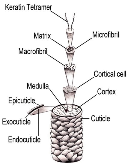 Hair, protective appendages on the body and structures of integument with sebaceous glands, sweat glands and nails are considered an important part of the body, derived from the skin ectoderm. They are also known as epidermal derivatives, since they originate from the epidermis during embryological development [2]. As described by Naizet [8], the hair is mainly constituted by three parts: the bulb, the root and the stem, and it is implanted in the pilosebaceous follicle in the dermis. The bulb is the deepest end of the hair and is also the portion that makes it grow. It is connected to the richly innervated and vascularized dermal papillae, which allow the contribution of nutrients necessary for hair growth [8]. The root is firmly fixed in the hair follicle, the part of the hair located between the bulb and the surface of the epidermis where hair takes the form of the stem. The root and stem are made of the same three concentric layers: the medulla, the cortex and the cuticle on the outside (Figure 1). The medulla is the central core. The next stratum, the cortex, represents the largest and thickest part of the hair determining many of their mechanical properties [1,8,9]. The cortex is made of packed spindle-shaped cortical cells, filled with keratin filaments parallelly oriented to the longitudinal axis of the hair shaft, and of an amorphous matrix of high sulfur proteins (Figure 1) [10]. In particular, cysteine residues in adjacent keratin filaments tend to form covalent disulfide bonds with a strong crosslink between adjacent keratin chains [9]; thus, it contributes to providing the shape, the stability, and the texture of the hair [9]. The cuticle is a very resistant layer of overlapping dead cells that form a protective barrier against the outside environment and external aggressions. It consists of endocuticle and exocuticle [10]. Normal cuticles have a smooth appearance, allowing light reflection and limiting friction between the hair shafts. Indeed, it is responsible for the hair luster and texture.
