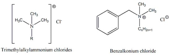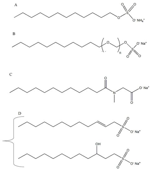 Figure 2. Structure of some anionic surfactant using the example of the C12 chain length representatives: (A) Ammonium lauryl sulfate; (B) Sodium laureth sulfate; (C) Sodium lauroyl sarcosinate; (D) Dodecyl alpha olefin sulfonate, Sodium salt. - Cationic surfactants have a positively charged hydrophilic end are used mainly as conditioners, being able to balance hair negative charges after washing, reducing frizz. Indeed, they are efficient softeners and substantive for hair because of the hair’s low isoelectric point (pH 2.15–3.17) [14]. Typical examples are trimethylalkylammonium chlorides, benzalkonium chloride or bromide, and so on (Figure 3) [4]. Due to their chemical nature, they also have bacteriostatic properties [4].