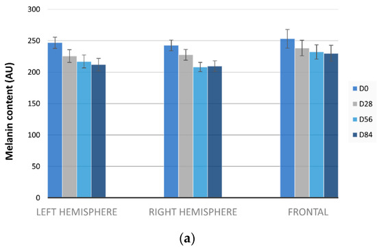 A statistically significant reduction in the area of UV spots was detected in the three facial regions (right and left hemispheres and frontal region) in comparison with D0 at all the assayed times (D28, D56 and D84) (p < 0.05) (Figure 6B).