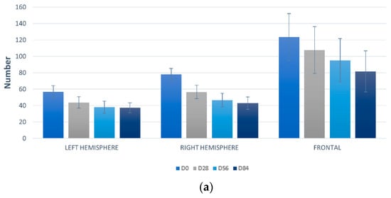 A statistically significant reduction of the number of UV spots at D56 and D84 (Student’s t-test p <0.05) was detected in the left hemisphere and in the frontal facial region in comparison with D0. Additionally, in the right facial hemisphere the number of UV spots also showed a significant decrease at D28 (Student’s t-test p < 0.05) (Figure 6A).