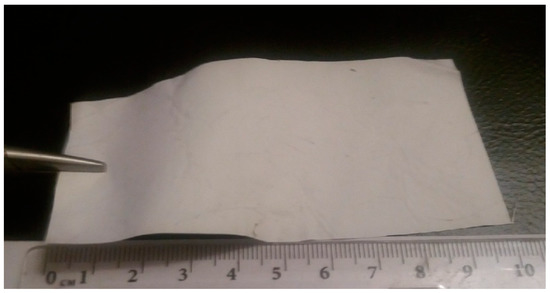 In the preparation of nanofibers by electrospinning, aliphatic copolyamide (Anid OOO, Yekaterinburg, Russia) with a molecular weight(Mw)of about 30 kDa was used. In the preparation of composite nanofibers by electrospinning, chitosan with Mw = 120 kDa and deacetylation degree of 92% was used (Bioprogress OOO, Voronezh, Russia). Сhitin nanofibrils (SRL Mavi Sud, Aprilia, Italy) were used as a filler. The concentration of chitin in the aqueous dispersion was 31.9 mg/mL, the electrical conductivity of the dispersion (σ) was equal to 116 μS/cm, and the pH was4.87. Glacial acetic acid was purchased from Vekton ZAO (Saint Petersburg, Russia). PEO with Mw = 900 kDa was purchased from Union Carbide Сorp (Houston, TX, USA). The thickness of CoPA nanofibers layer was 100–150 μm, and the thickness of the layer of composite nanofibers was 50 μm. Electrospinning was performed using a NANON 01 instrument (Ogōri-shi, Japan) at a voltage of 18 kV; the distance between electrodes was 0.15m. The resulting material (size: 10 cm × 5 cm) is shown in Figure 1.