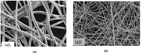 Microphotographs of CoPA fibers (a) and chitosan-based composite nanofibers containing chitin nanofibrils (b).
