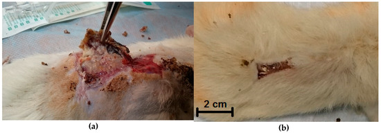 In the experimental groups, after modeling a third-degree burn (ICD 10) (10% from the animal surface area) (Figure 2a) and necrectomy and fixation of wound edges (Figure 2b), the wound surface was covered with appropriate dressings. The surface area of the burn was 16 cm2. The animals were observed for four weeks. Observations, planimetric assessment, and biopsy were performed at 7, 14, 21, and 28 days; morphological studies of biopsy samples were carried out. All manipulations were performed under inhalation anesthesia with diethyl ether and in strict compliance with the provisions of WMA Declaration of Helsinki.