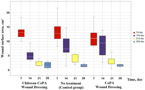 However, taking into consideration that the wound surface area is dependent on the exposure time (Figure 5), the porous film from the CoPA does not meet the requirements for materials for wound dressings. The area of the wound surface decreases at almost the same rates (Figure 5 and Figure 6) as in the control group, in which no wound dressing was applied. Therefore, to accelerate the wound healing an additional layer of biocompatible polymer, such as chitosan, is essential.