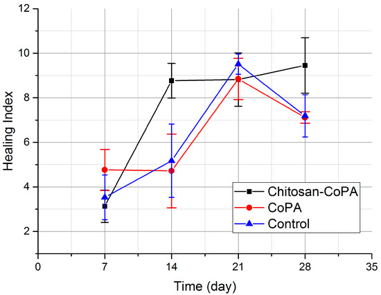 A graph of the dynamics of the healing indices (Figure 6) shows that the chitosan‒CoPA group has a significant increase in value on the 14th day, unlike other groups, in which these values were reached only by the 21st day. Moreover, it is demonstrated that on the 28th day there is no decrease in this dynamic. Thus, it can be argued that in the case of chitosan‒copolyamide dressings, tissue regeneration not only begins much earlier than in the other groups, but also has a plateau-like character, while CoPA and control show peak-like dynamics with a maximum on the 21st day.
