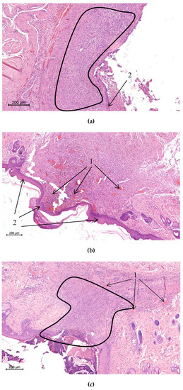 Histological view of the scar area of a rat from the control (a), chitosan‒CoPA (b), and CoPA (c) groups (magnification: 5×). The selected areas are neutrophilous leukocytes infiltrated tissues; 1—microvessels; 2—newly formed epithelium.