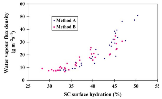Water vapour flux density (WVFD) data (Method A) versus opto-thermal transient emission radiometry (OTTER) (Method B) from the volar forearm [102].