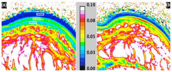MRI T2 mapping (seconds); (a) before—with ROI’s in the stratum corneum, epidermis and dermis; and (b) 1 h after moisturiser application [148].