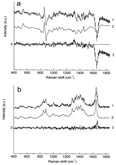 Raman spectra obtained at different depths below the skin surface by means of the qualitative least-squares fit. (a) (1) Difference between Raman spectra obtained at the skin surface and at 10 m below; (2) fit result; (3) residual (curve 1–curve 2). (b) (1) Difference between Raman spectra obtained at 60 m and 70 m below skin surface; (2) fit result; (3) residual (curve 1–curve 2) [193].