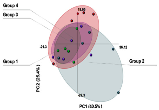 Scores plot of PCA analysis of NIR spectra acquired from individuals with varied moisturizing patterns. (Group 1) daily, (Group 2) none, (Group 3) daily & dry skin, and (Group 4) random. Vairability indicated by size of oval grouping [250].