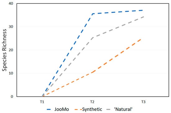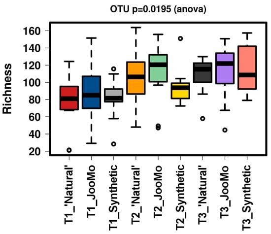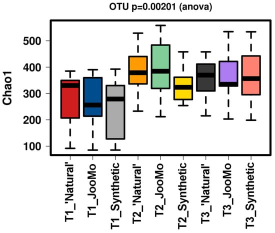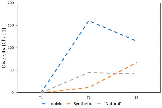 In all shown box plots, the black bar shows the mean. Using the mean values from Figure 1 and Figure 2, Figure 3 and Figure 4 were created. The accompanying Table 2 and Table 3 give the percentage change in each graph. The increasing diversity effect also appeared for product groups (Figure 5, Figure 6, Figure 7, Figure 8, Figure 9 and Figure 10C). Chao1 and Richness indices are also shown comparing only T1 with T2 and T1 with T3 (Figure 5, Figure 6, Figure 7, Figure 8, Figure 9 and Figure 10A,B). In these figures, a significant increase in Chao1 is observed in JooMo for both the compared time points, only for T1/T3 in the synthetic group, and only for T1/T2 in the ‘natural’ group. The increase in richness is significant for one of the two time point comparisons in the JooMo group, for both in the ‘natural’ group, and T1/T3 in the synthetic group.