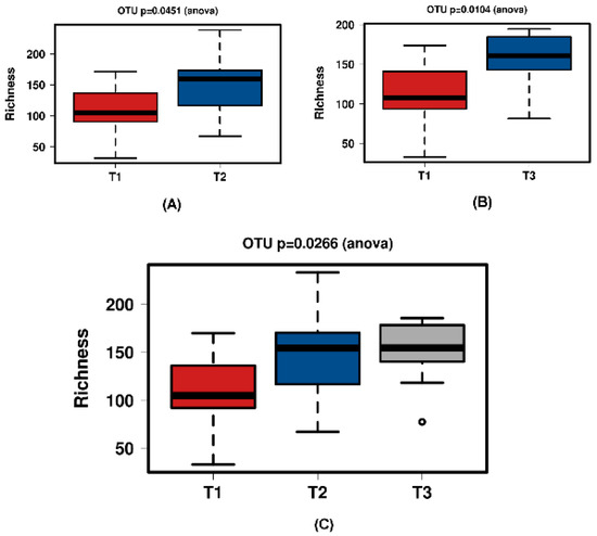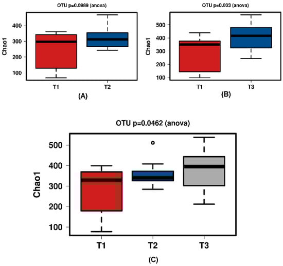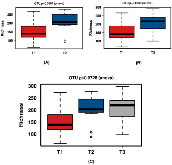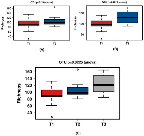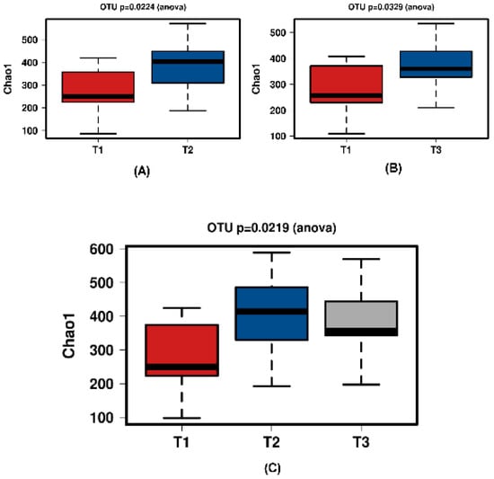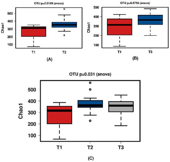 All groups displayed an increase in the α-diversity over time, as shown in Chao1 and richness indices with T1 sample points split for the three different groups (Figure 1 and Figure 2). The values for the Chao1 diversity quartiles shown in Figure 1 are shown in Table 1.