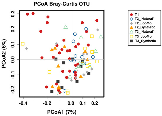 Comparing the β-diversity of the different product groups over all time points with only time point three did not show any significance. An example for β-diversity is shown in the PCoA Plot from the different time points per group (Figure 11). This is shown again with T1 split between the product groups. The outlying T1 sample points moved towards the ‘crowd’ during product use (Figure A1).