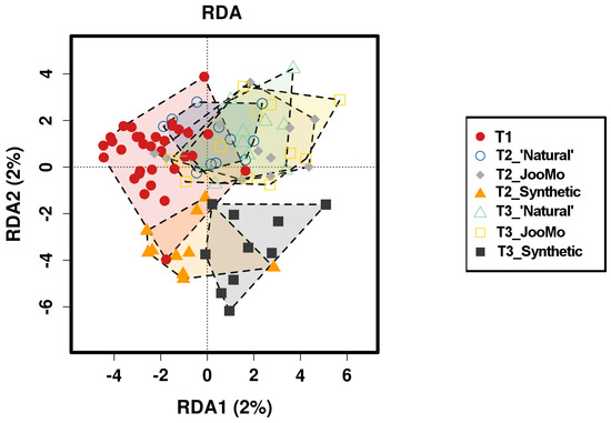 Redundancy analysis (RDA) plot of the different time points per group and T1 as basic dataset before product use.