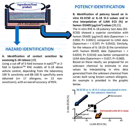 In the epidermal equivalent IL-18 assay, ingredients (or final products) are topically applied to the epidermal equivalent surface for 24 h. Tissue viability is assessed by the MTT reduction assay, while IL-18 is measured in the culture medium by ELISA. The in vivo values will then be estimated using standard curves constructed from data obtained by testing reference allergens of different potency (e.g., DNCB, isoeugenol, eugenol, benzocaine). In the graphic shown in Figure 1, data variability for both in vitro and in vivo data (where available) was omitted on purpose as currently for the calculation of the margin of safety a single value is still used (i.e., NOAEL). Data variability can be easily included. At present, only a limited number of chemicals have been tested, additional chemicals need to be tested to confirm the results and the usefulness of the proposed method, but the results are very encouraging.