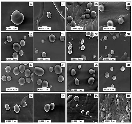 The ethosomes exhibited regular and smooth surfaces, and in few cases (i.e., samples 6H and 7H) halos were observed around the vesicles, which were possibly attributed to the prevalence of LUV. These features were independent of the processing conditions. The SEM images of the aqueous dispersions indicated that sample 7H presented the largest number of regular vesicles featuring thick walls. Once these vesicles were subjected to drying, they coalesced and formed a thin film for subsequent analysis by SEM, it is possible that one of the components of the formulation acts as a protector against dehydration, avoiding the tendency of the vesicles to aggregate.