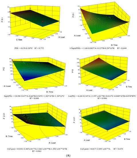 The ZP values refer to the charges on the slipping plane at the surface of the vesicle, and although they are not direct measurements of the surface charge, they are still good estimates. It is well known, that the oppositely charged ions in the slipping plane travel alongside the charged surface, the ions underneath the plane remain attached to the surface. Thus, the ZP values are good indicators of the electrostatic interactions between vesicles and are normally used to predict the stability of dispersions, since colloidal systems are not stable close to the point of zero charge []. Even though soy lecithin consists of a mixture of several phospholipids of different charges, phosphatidylcholine (PC) is the most prevalent phospholipid and presents a net charge of zero []. Only phosphatidylserine which is present in a lower amount in lecithin features a negative charge rendering a slightly negative charge to the vesicles (−67.7 mV). This negative charge is boosted by the presence of a large fraction of ionized FA. Negatively charged ethosomes exhibit advantages over cationic systems such as stearylamine, which have been reported to be toxic due to the interaction of the cationic lipids with cell organelle membranes. In addition, negatively charged ethosomes are more efficiently associated []. Moreover, the net negative charges of the ethosomes increase their physical stability, thus preventing their fusion and aggregation due to electrostatic repulsions. Interestingly, ethanol also renders some degree of steric stabilization to the ethosomes and prevents the aggregation of the vesicles due to electrostatic repulsions []. It is expected that FA would be primarily entrapped within the inner aqueous core of ethosomes, where the rigid aromatic ring is oriented between the lipid bilayers near the phosphate head group. Furthermore, phosphate groups could be exposed at the surface of the carboxyl groups of FA, thus providing additional shielding. The magnitude of this protective effect was more noticeable at high FALs. Higher FALs (100 mg) also was prompted to reduce the charge intensity. The results of the different tests performed are listed in the Table 1, and the plots obtained from the factorial models along with the significant factors are depicted in Figure 2.