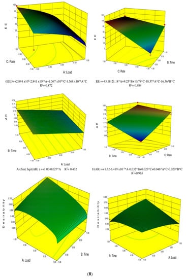 (A) Response surface graphics for preparation methods in cold (Left) and hot (Right) for the parameters: polydispersity index (PDI), Particle size (PS) and zeta potential (ZP); (B) Response surface graphics for preparation methods in cold (Left) and hot (Right) for the parameters: encapsulation efficiency (EE), aspect ratio (AR) and desirability.