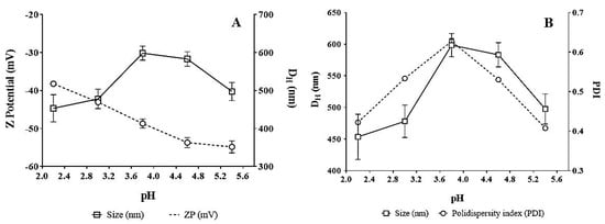 The effect of pH on the optimized ethosomal dispersion is depicted in Figure 4. The ZP value became more electronegative (−54.8 mV at pH 5.4) as the pH of the media approached neutrality (Figure 4A). This was essentially attributed to the ionization of phospholipids containing soy lecithin and incorporated FA, which generated negative charges on the phosphate groups located on the surfaces of the vesicles. The interaction between phospholipids and FA is known to be specific and dependent on polar and van der Waals interactions. Van der Waals interactions occur between the hydrocarbon chains and aromatic rings and between the polar heads of phospholipids and carboxyl groups leading to compact and rapid binding of FA, which results in increased intermolecular spaces between the polar heads. On the other hand, the size of the ethosomal vesicles did not present any trend as the pH changed. Vesicle size presented minimum and maximum values of 453 and 598 nm at pH 2.2 and 3.8, respectively. In addition, ZP reached a plateau at ~4.5 probably due to the contribution of FA since its pKa is 4.5 and, at this pH, equal contributions of the ionized and nonionized forms of FA were expected. The lower the pH or acidity of the media the higher the availability of H+ ions to create a shielding charge on the surface of the ethosomes, which led to a less negative charge (–55 to –40 mV). However, at higher pH levels, the ionized form of FA was prevalent and contributed to the negative value of the surface charge of the vesicles. On the other hand, the particle size of the vesicles reached a maximum when the pH ranged between 3.8 and 4.5, possibly due to the interaction of the hydrophilic heads of the phospholipids with FA causing a displacement of the acid-base equilibrium. Furthermore, the pKa of PC was ~4, and thus, at this pH the size variation or compaction of ethosomes was large and hence, a singularity was observed in the PDI (Figure 4B).