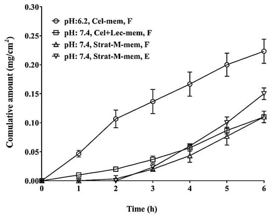 Membrane diffusion studies of FA. Cel-mem: Cellulose membrane, Cel+lec-mem: Cellulose membrane with soy lecithin, Strat-M-mem: Strat-M® membrane, F: free compound, and E: encapsulated compound.