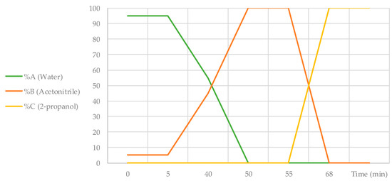 Multistep gradient of water (A), acetonitrile (B), and 2-propanol (C), all acidified with 0.1% formic acid used for the HPLC analyses.