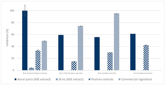 Bioactivities of P. domestica extracts obtained via ASE using EtOH compared with the bioactivities of commercial cosmetic ingredients used for the respective activities tested (positive controls) and to the bioactivities of a commercial ingredient based on a Prunus persica extract.