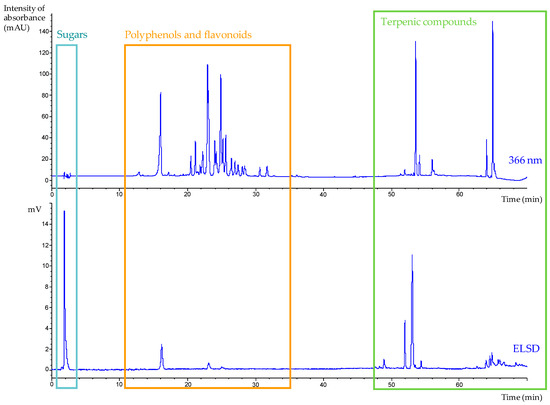 HPLC chromatograms obtained on a Luna® C18 column (150 × 4.6 mm; 5 μm) at 366 nm and with ELSD, presenting the major families of compounds identified in P. domestica leaves extract.