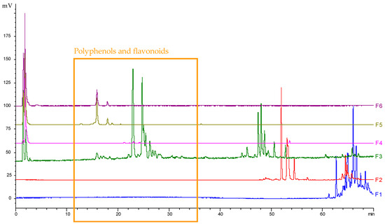 ELSD profiles obtained on a Luna® C18 column (150 × 4.6 mm; 5 μm) for the six fractions obtained via fractionation of the P. domestica leaves extract.