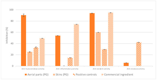 As shown in Figure 5, the P. domestica skins PG extract again displayed no significant activities; this bio-inactivity could be explained either by the absence of active molecules in plum skins or by the heating applied to ease the fruit peeling during the preparation of Pistoles [7], which may lead to degradation of thermolabile active compounds (for example, loss of anti-oxidant activity linked to thermal treatment and to the subsequent decrease of phenolic content was already reported in the literature [37,38]). Some exhaustive phytochemical characterisation could be considered to understand its bio-inactivity (and to potentially rule out one of these hypothesis), but given the absence of anti-aging properties, P. domestica skins were subsequently dropped from this study without further experimentation.